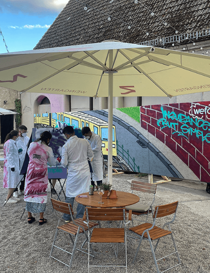 Zum Abschluss bringt ihr eure kreativen Highlights ein. Danach machen wir ein gemeinsames Teamfoto vor eurem Werk, und jede*r gestaltet ein eigenes 30x40 cm Kunstwerk auf hochwertigem Papier – ein persönliches Andenken an euer Team Event.