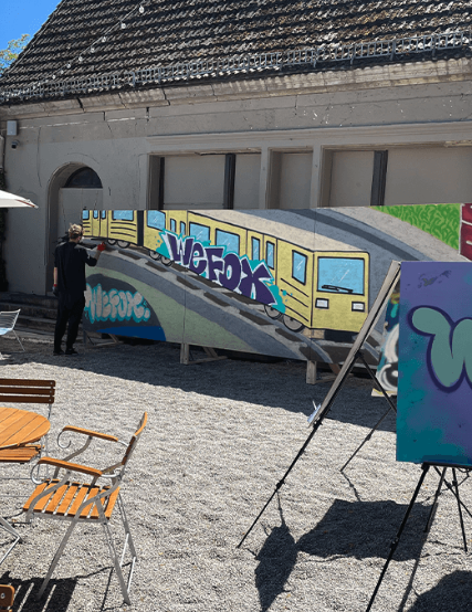 Beim Wefox Summer Jam haben wir gemeinsam ein kreatives Highlight gesetzt. Auf einer mobilen Wand entstand ein Throw-Up auf einer Berliner U-Bahn, während die Teilnehmenden ihre eigenen Kunstwerke auf Leinwänden gestalteten, die sie als Erinnerung mitnehmen konnten.