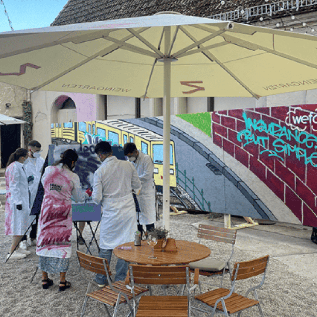Kunst verbindet, inspiriert und schafft bleibende Erinnerungen. Unser Team aus erfahrenen Künstlerinnen und Workshop-Leiterinnen freut sich darauf, gemeinsam mit euch kreative Visionen umzusetzen – sei es in einem Teambuilding-Workshop, einer Wandgestaltung oder einem einzigartigen Street Art-Projekt.